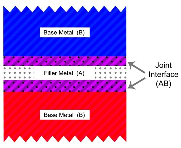 Brazing’s high strength can be explained by examining a joint cross-section. When the filler metal flows out onto the base metal, a process called wetting occurs. To oversimplify, the filler metal (A) dissolves and reacts with the base metal (B) forming a thin layer called the joint interface (AB). This layer cools to form a totally different metal – actually an alloy of the base and filler metals. Thus, the brazed joint becomes a “sandwich” of different layers, each metallurgically linked to the next. The resulting joint is actually stronger than the base metals being joined.